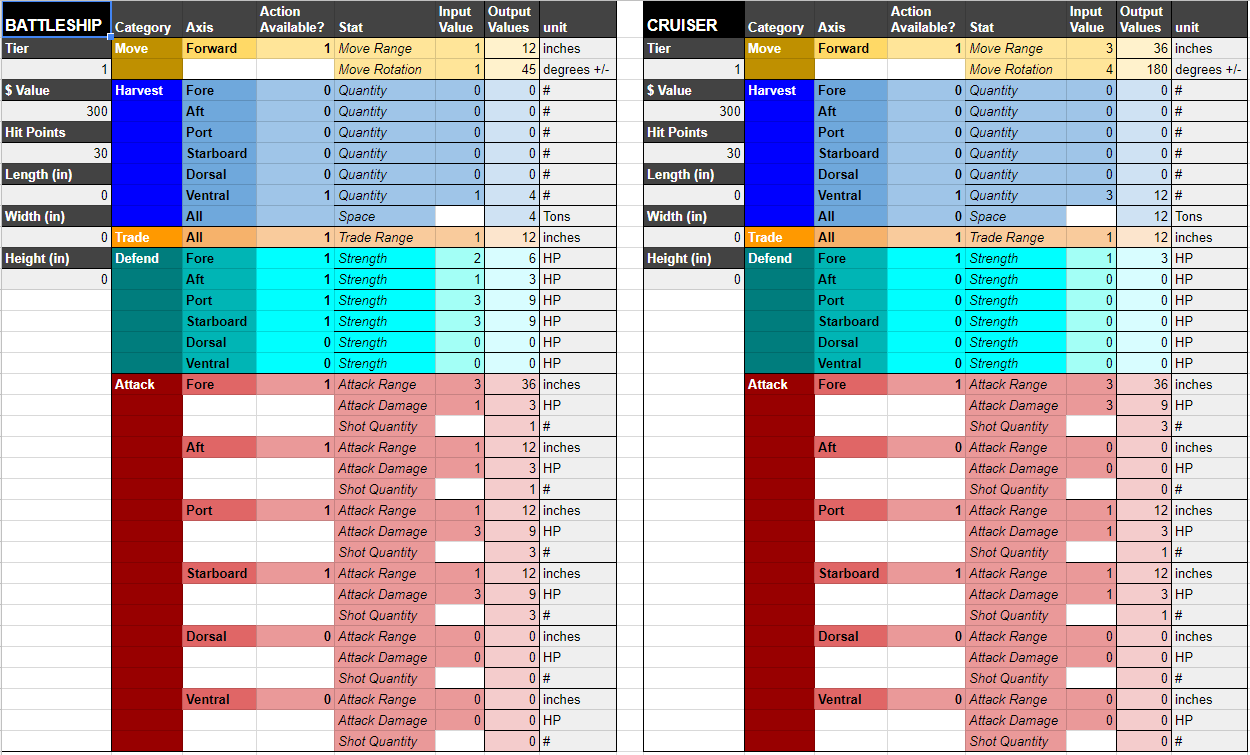 Ships in “Space Pirates” have four different actions they can use during gameplay: “Harvest”, “Trade”, “Defend”, and “Attack” as well as movement. These four actions had different parameters that each needed to be balanced against each other. Since a core part of our game was 3 dimensional movement of spaceships, I wanted the ships to vary in which of their quadrants (Fore, Aft, Port, Starboard, Dorsal, and Ventral) they could use each action and how good they were at it. Due to time constraints only Attack and Defend vary in quality and positioning, Harvest only changes in positioning, and Trade is static for each ship.