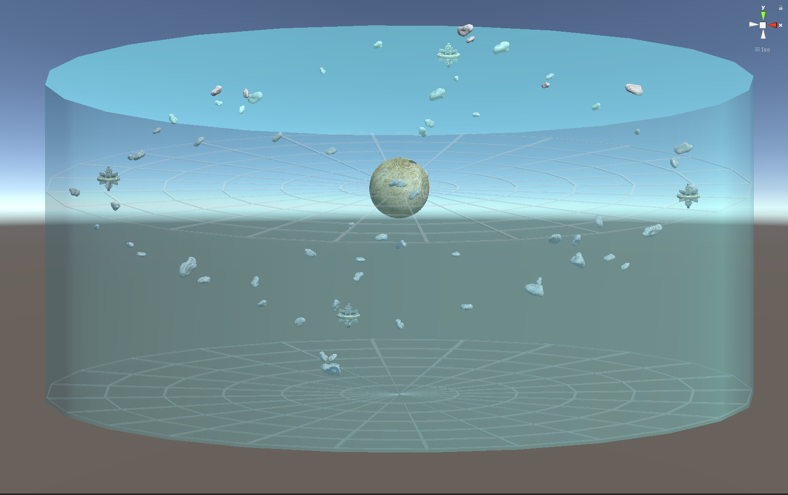 Space Pirates had the interesting challenge of combining board games with AR. We started off the semester assuming our game would take place on a tabletop, with floating ships hovering above it. However, I soon realized that the table was just getting in the way of the game, and by removing the table players could more easily maneuver their ships, and play across a larger area. So I decided to plan for a room scale experience people could play in their living rooms. But what’s the ideal play space? I tested several variations of the space until settling on an 8 foot diameter cylinder, with the center of the plane at 4 feet. This size was large enough to give players room from bumping into each other, but not so large that they didn’t feel connected in the game.